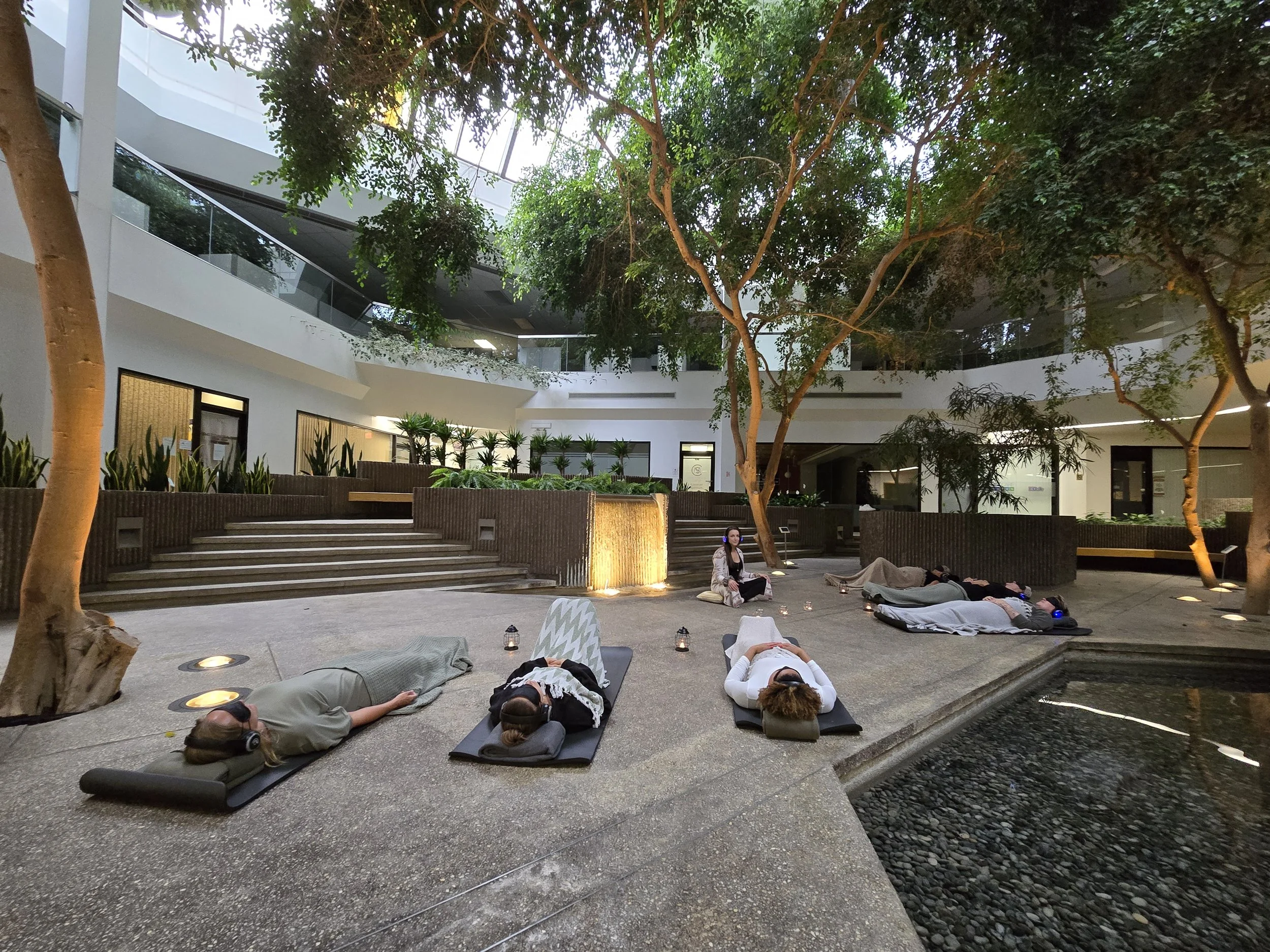 Through guided breathing patterns and immersive sound, students are invited into a structured experience that helps them slow down, release tension, and develop greater self-awareness.